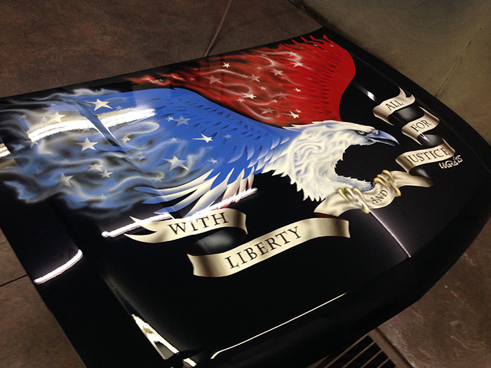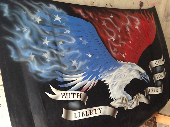 I airbrushed this graphic patriotic eagle onto a truck hood for a competition. I did not win, but I had a great time painting here. The photos above show the before and after stages of clear coating the hood.