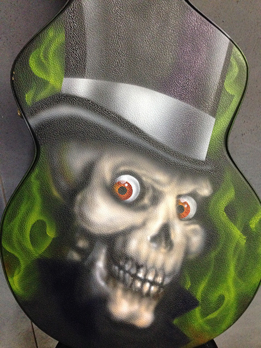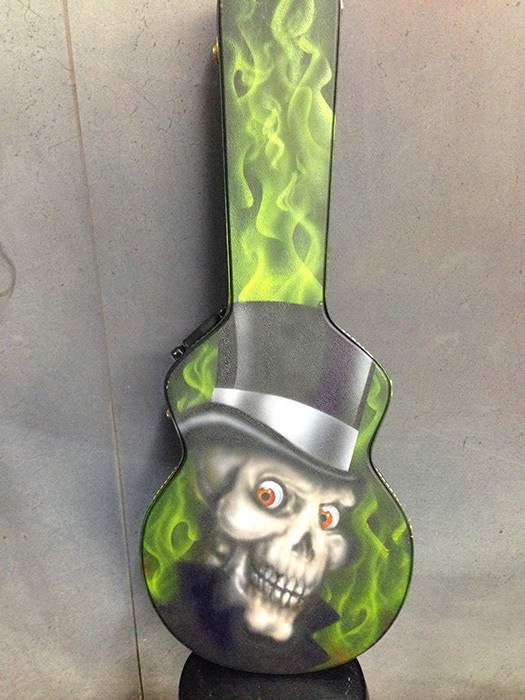 This is my own guitar case I airbrushed to learn how the vinyl material accepted acrylic paint. I learned a lot while painting this case.